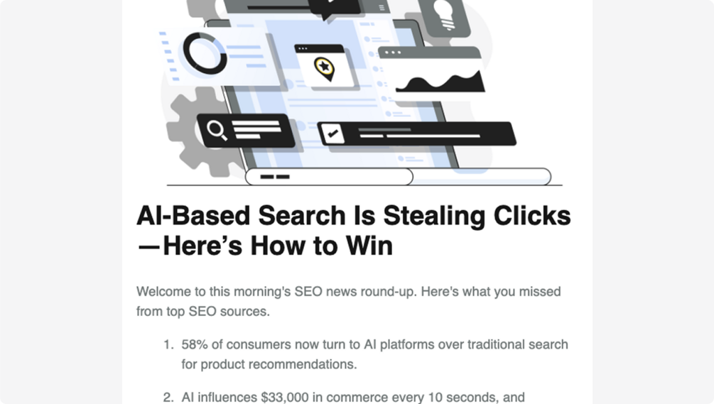 Daily AI newsletter creation that turns trusted SEO news into ready-to-send content for you and your audience.