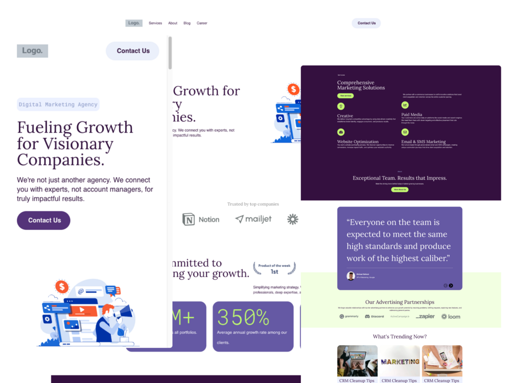 Color palette: Deep purple backgrounds, crisp white sections, and bold green accents for a confident, modern agency look.