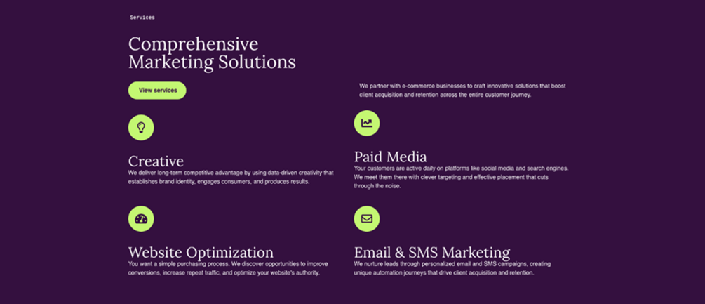 ✅ Feature grid highlighting services (Paid Media, Website Optimization, Email & SMS Marketing, Creative)